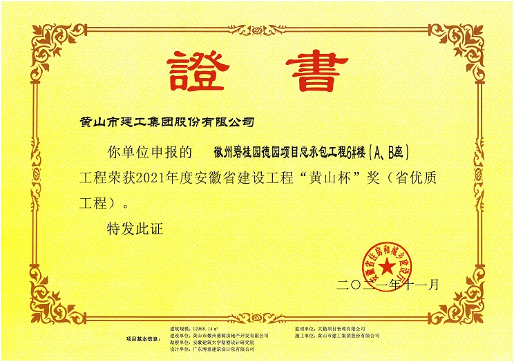 由黃山建工集團(tuán)承建的徽州區(qū)碧桂園德園項目總承包工程6#樓(A、B座) 工程榮獲安徽省工程質(zhì)量最高獎“黃山杯”獎。該工程在開工伊始,項目部就制訂了創(chuàng)優(yōu)目標(biāo),嚴(yán)格過程控制,建立健全項目質(zhì)量管理體系,狠抓現(xiàn)場施工管理,把好施工過程質(zhì)量控制關(guān),為創(chuàng)精品工程打下堅實的基礎(chǔ)。
