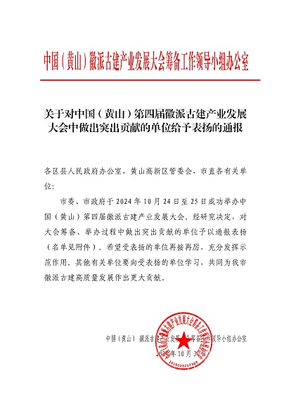 市委、市政府于2024年10月24日至25日成功舉辦中國(黃山)第四屆徽派古建產(chǎn)業(yè)發(fā)展大會。近日,中國(黃山)徽派古建產(chǎn)業(yè)發(fā)展大會籌備工作領(lǐng)導(dǎo)小組辦公室發(fā)布《關(guān)于對中國(黃山)第四屆徽派古建產(chǎn)業(yè)發(fā)展大會中做出突出貢獻(xiàn)的單位給予表揚(yáng)的通報》,黃山建工集團(tuán)榮列其中。